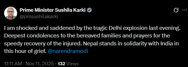 ‘दिल्लीमा हिजो साँझ भएको त्रासद विस्फोटको घटनाले मलाई स्तब्ध र दुःखी बनाएको छ । घटनामा मृत्यु भएका मानिसको परिवारसँग मेरो समवेदना छ र घाइते भएकाहरूको शीघ्र स्वास्थ्यलाभका लागि म प्रार्थना गर्छु । शोकको यस घडीमा नेपाल भारतसँग एक्यबद्धता प्रकट गर्दछ,’ प्रधानमन्त्री कार्कीले भारतका प्रधानमन्त्री नरेन्द्र मोदीलाई मेन्सन गर्दै पोस्टमा उल्लेख गरेकी छन् ।