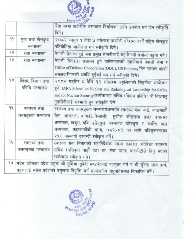 सरकारले भारतको विशाखापटनम्मा २०८२ कात्तिक २८ देखि २९ गतेसम्म आयोजना हुने नेपाल भारत समन्वयात्मक बैठकमा सहभागी हुन उद्योग, वाणिज्य तथा आपूर्ति मन्त्री अनिल कुमार सिन्हालाई स्वीकृति प्रदान गर्ने निर्णय गरेदखि राष्ट्रिय परिचयपत्र तथा पञ्जीकरण (दोस्रो संशोधन) नियमावली, २०८२ स्वीकृत गर्ने, भू उपयोग नियमावली २०८२ स्वीकृत गर्नेसहितका निर्णयहरू मन्त्रिपरिषदले गरेको छ ।