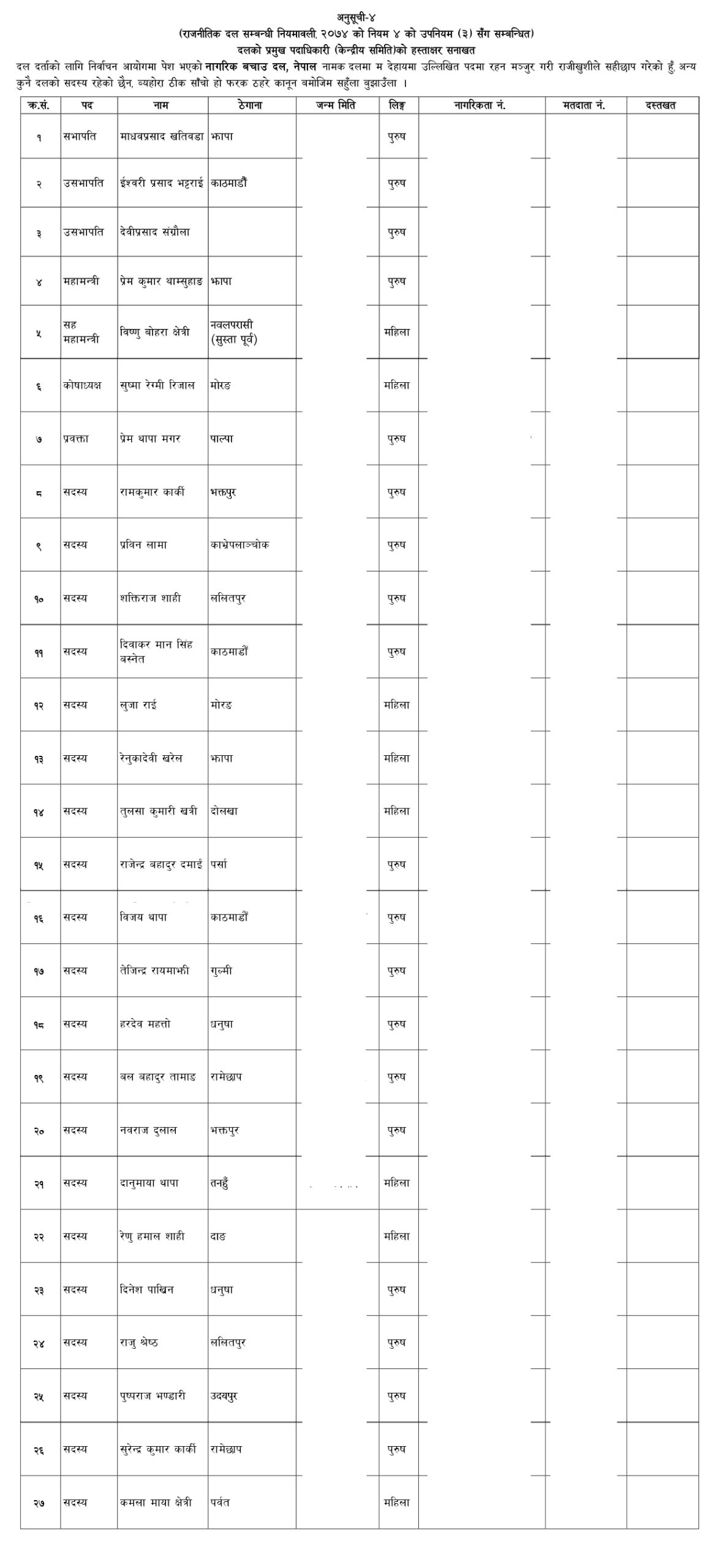 त्यसैगरी, महासचिवमा झापाका प्रेमकुमार थाम्सुहाङ, सहमहासचिवमा नवलपरासी पूर्वका विष्णु बोहोरा क्षेत्री, कोषाध्यक्षमा मोरङकी सुष्मा रेग्मी रिजाल र प्रवक्तामा पाल्पाका प्रेम थापा मगरलाई प्रस्ताव गरिएको छ।