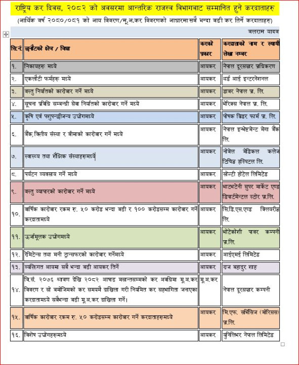 २०७६ देखि २०८२ सम्म नियमित मूल्य अभिवृद्धि कर तिर्नेमा नेपाल दूरसञ्चार कम्पनी, बार्षिक ५० करोडसम्मको कारोबार गर्ने करदातामा भिएफ सभिसेस (मोरिसस) र विशेष उद्योगहरुमध्ये सबैभन्दा बढी आयकर तिर्नेमा युनिलिभर नेपाल लिमिटेड परेको छ । सरकारकारले हरेक वर्ष मंसिर १ गते कर दिवस मनाउने र त्यो भन्दा अघिल्लो आर्थिक वर्षमा सबैभन्दा बढी कर तिर्नेलाई सम्मान तथा कदरपत्र प्रदान गर्दै आएको छ ।