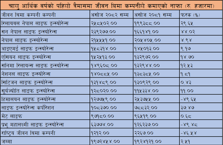बिमा कम्पनीहरुले सार्वजनिक गरेको चालु आर्थिक वर्ष २०८२/८३ को पहिलो त्रैमासिक वित्तीय विवरणअनुसार जीवन बिमा कम्पनीको नाफामा सामान्य वृद्धि भए पनि निर्जीवन बिमा कम्पनीहरु भने नोक्सानीमा धकेलिएका छन् ।