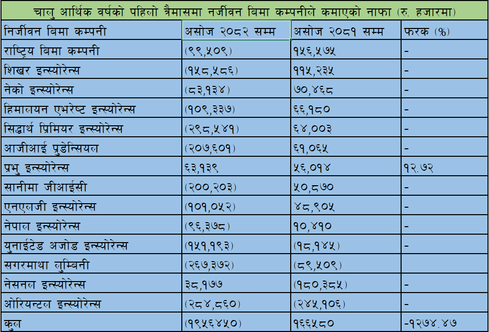 धेरैजसो जीवन बिमा कम्पनीले सामान्य रुपमा भएपनि नाफा बढाउँदै गर्दा अधिकांश निर्जीवन बिमा कम्पनी भने नोक्सानीमा धकेलिएका छन् । निर्जीवन बिमा कम्पनीमा प्रभु इन्स्योरेन्स र नेशनल इन्स्योरेन्स बाहेक सबै कम्पनीको नाफा ऋणात्मक देखिएको छ ।