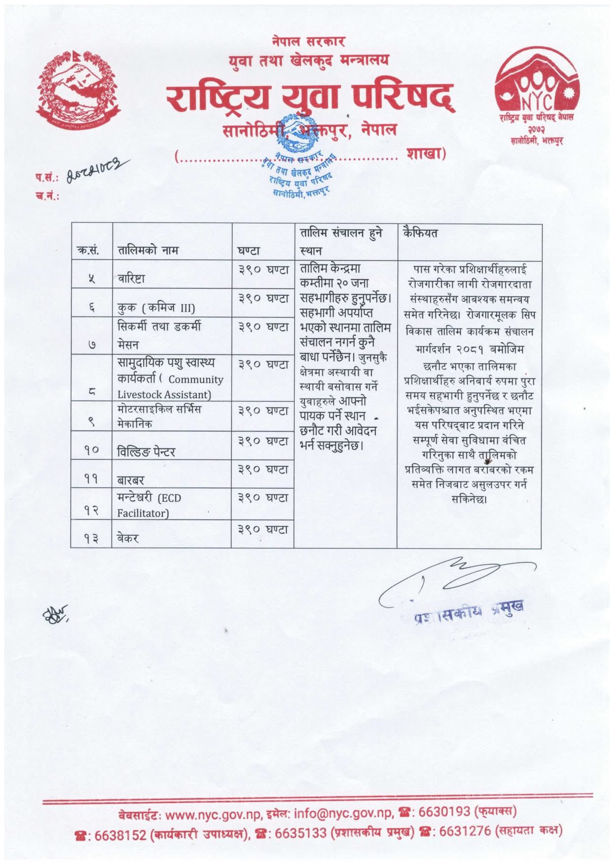 परिषद्ले १३ विधामा तालिमको लागि आवेदन खुलाएको हो । प्रत्येक बिधाको तालिम अवधी भने ३९० घण्टा छुट्टयाइएको छ । परिषद्ले प्लम्बर, टेलर(सिलाई कटाई), असिस्टेण्ट व्युटीशिएन, बिल्डिङ इलेक्ट्रिसियन, वरिष्टा, कुक(कमिज तेश्रो), सिकर्मी तथा डकर्मी मेसन, सामुदायिक पशु स्वास्थ्य कार्यकर्ता, मोटरसाइकल सर्भिस मेकानिक, बिल्डिङ पेन्टर, बारबर, भन्टेश्वरी र बेकर बिधामा तालिम गर्न इच्छुक युवाहरुले आवेदन दिन सक्ने व्यवस्था गरिएको छ ।