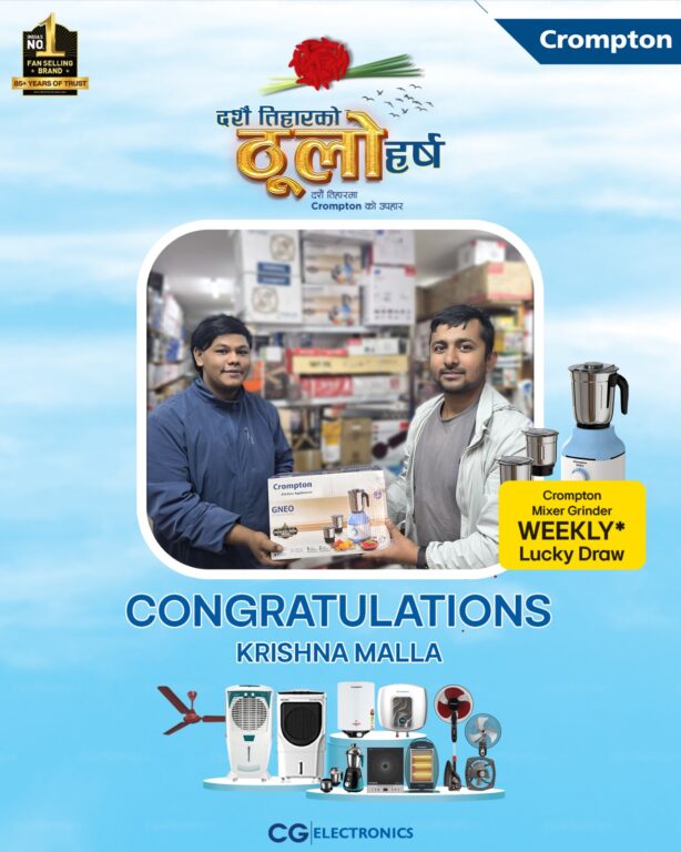 काठमाडौं । सिजी इलेक्ट्रोनिक्सले सञ्चालन गरेको ‘क्रम्पटन दशैं–तिहारको ठुलो हर्ष’ योजनाका विजेता घोषणा गरेको छ । उक्त योजनाअन्तर्गत कृष्ण मल्ल विजेता बनेका छन् । मल्लले क्रम्पटनकै मिक्स्चर ग्राइन्डर जितेका छन् ।
