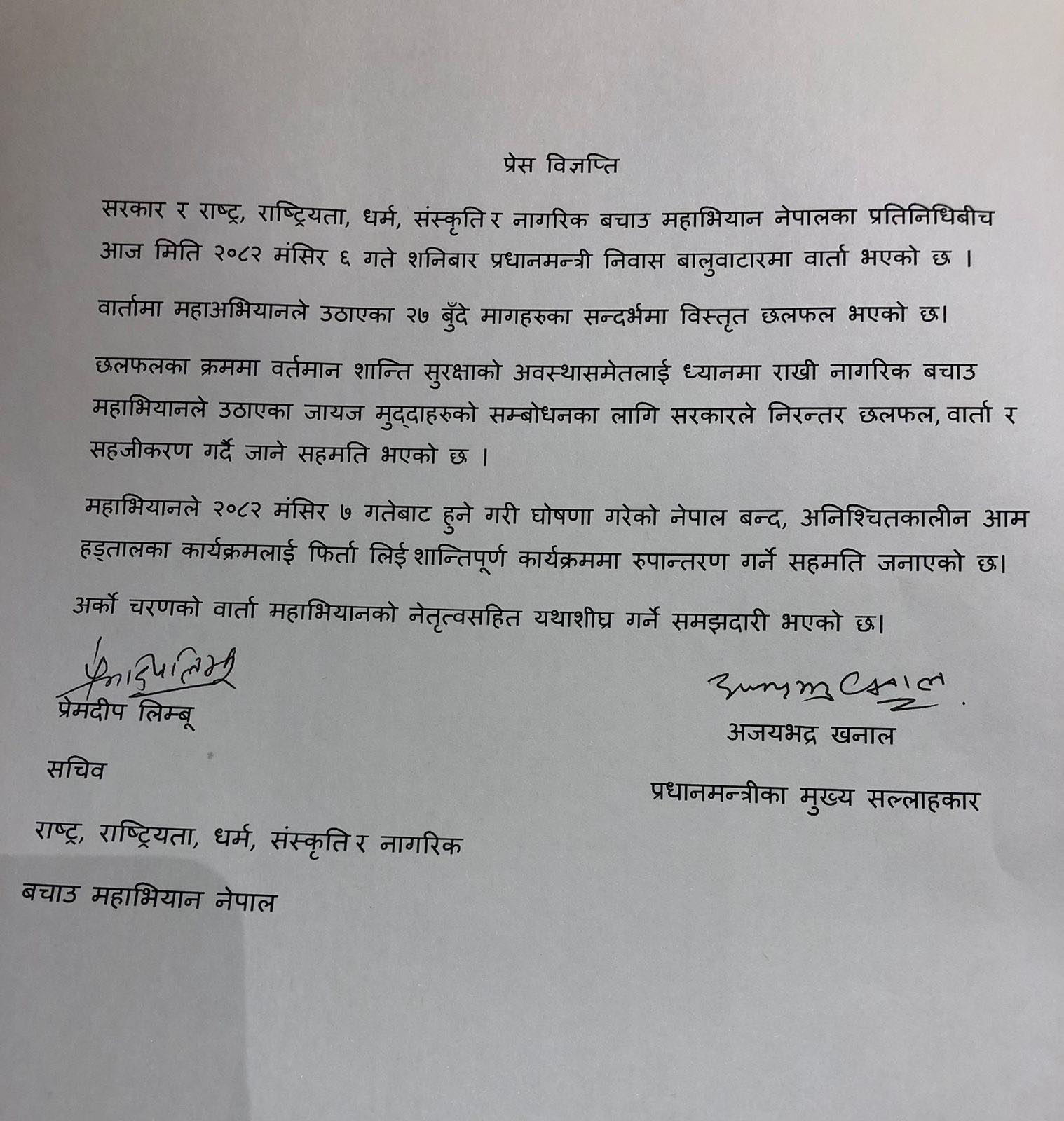 प्रसाईंको सरकार, राष्ट्र, राष्ट्रियता, धर्म, संस्कृति र नागरिक बचाउ महाअभियान नेपालका प्रतिनिधि र सरकारबीच शनिबार प्रधानमन्त्रीको निवास बालुवाटारमा भएको वार्तामा सहमति जुटेपछि महाअभियानले मंसिर ७ गतेदेखि घोषणा गरिएको नेपाल बन्द तथा अनिश्चितकालीन आम हड्ताल स्थगित हुने भएको हो ।