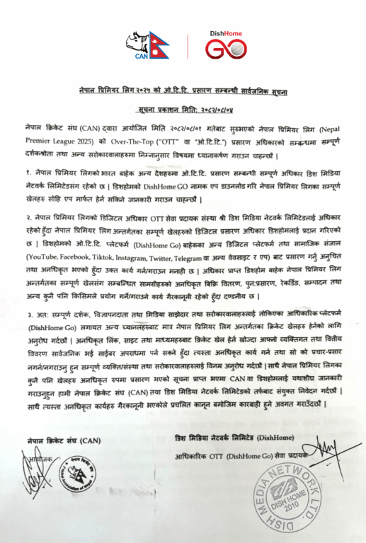 नेपाल प्रिमियर लिगको ओभर द टप (ओटीटी) प्रसारणसम्बन्धी सम्पूर्ण अधिकार पाएको डिश मिडिया नेटवर्कले सार्वजनिक सूचना जारी गर्दै सचेत गराएको हो ।