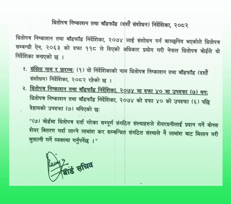 संशोधित निर्देशिका, २०८२ अनुसार निर्देशिकाको दफा ४० मा नयाँ उपदफा (७) थपिएको छ, जसअनुसार बोर्डमा धितोपत्र दर्ता गरेका सबै संगठित संस्थाहरूले सेयरधनीलाई बोनस सेयर वितरण गर्दा लाग्ने लाभांश कर सम्बन्धित संस्थाले नै बोनसबाट मिलान गरी भुक्तानी गर्ने व्यवस्था गर्नुपर्ने स्पष्ट उल्लेख गरिएको छ ।