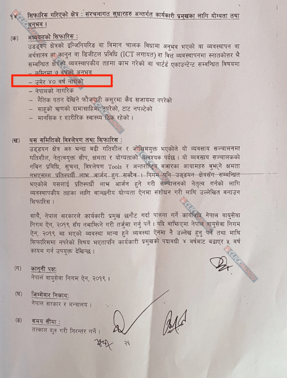 वायुसेवा निगमका महाप्रवन्धक छनोट समितिले कात्तिक २७ मा १५ दिनको समय दिएर माग गरेको दरखास्तमा ३० वर्ष उमेर पूरा भएको र ६५ वर्ष ननाघेको हुनुपर्ने उल्लेख गरेको छ । यो व्यवस्था वायुसेवा निगम ऐन २०१९ तथा यस अघि वायुसेवा निगमको संरचनागत सुधारसम्बन्धी कुलबहादुर लिम्बु नेतृत्वको एक समितिले दिएको प्रतिवेदन विपरीत भएको दाबी गरिएको छ ।