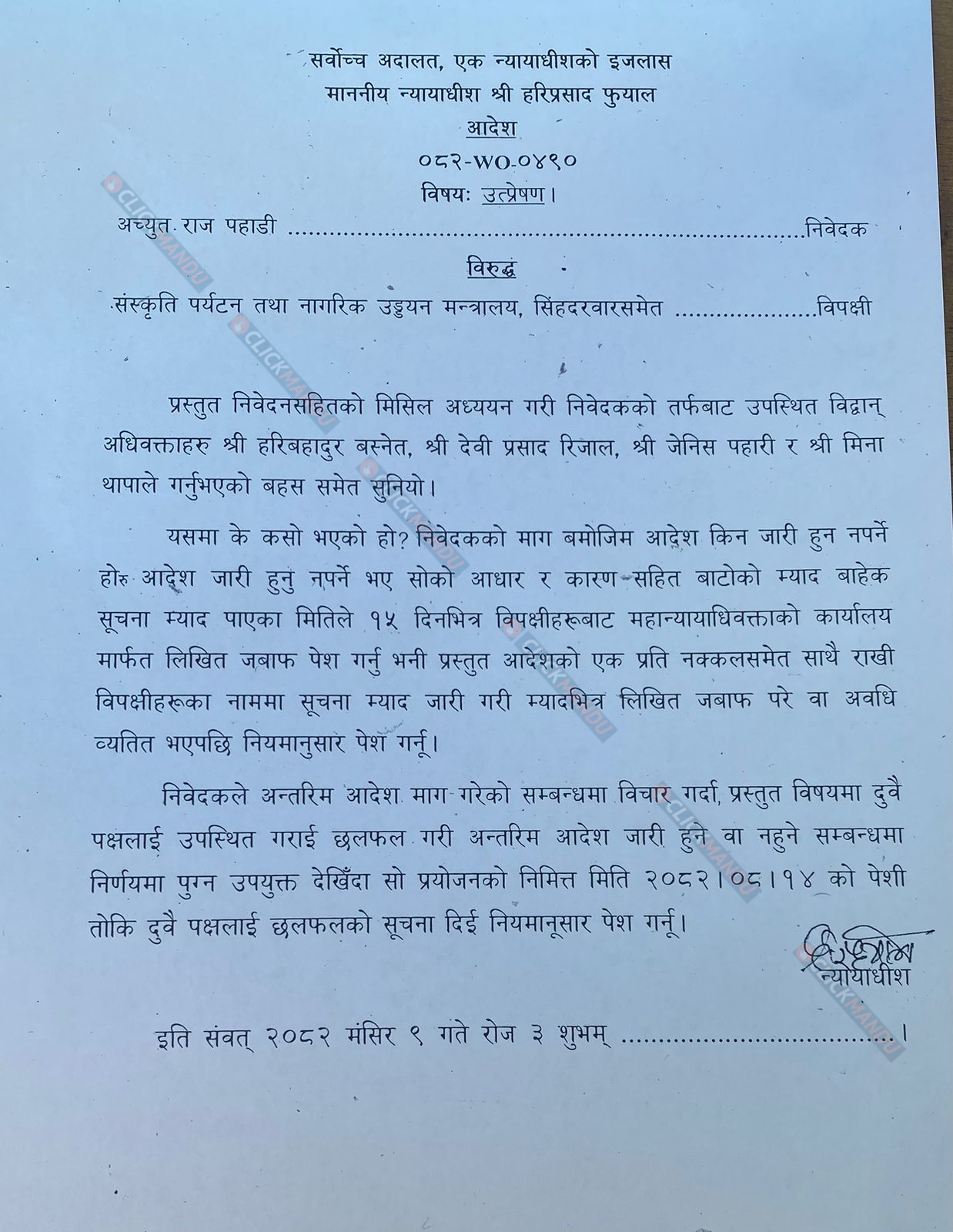 पहाडीको रिटमाथि सर्वोच्च अदालतका न्यायाधीश हरिप्रसाद फुँयालको एकल इजालासले मंसिर ९ मा प्रारम्भिक सुनुवाइ गर्दै दुबै पक्षलाई छलफलमा बोलाएको छ । सर्वोच्चले यस रिटका सम्बन्धमा १५ दिनभित्रै कारण पेश गर्न आदेश दिएको छ भने दुबै पक्षलाई छलफलमा बलाउने गरी मंसिर १४ गते (आइतबार)का लागि पेसी तोकेको छ ।