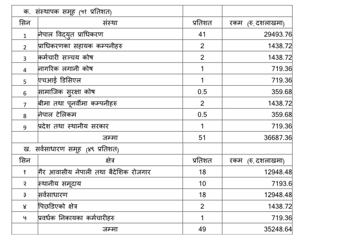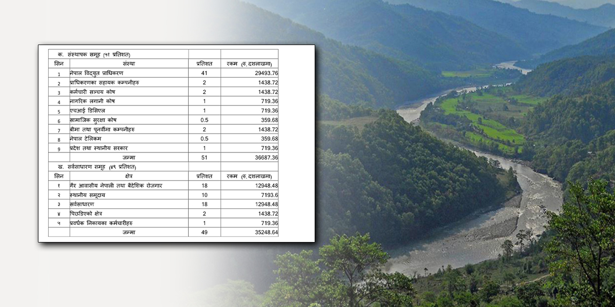 आयोजनाको प्रवर्धक कम्पनीमा प्राधिकरणको ४१ प्रतिशत संस्थापक शेयर अर्थात २९ अर्ब ४९ करोड रुपैयाँको लगानी रहनेछ । १ अर्ब ४४ करोड र १ अर्ब ४४ करोड (२-२ प्रतिशत) प्राधिकरणका सहायक कम्पनी, कर्मचारी सञ्चय कोष एवम् बीमा तथा पुनर्बीमा कम्पनीको, ७१ करोड ९३ लाख लाख र ७१ करोड ९३ लाख लाख नागरिक लगानी कोष, एचआईडीसीएल, प्रदेश एवम् स्थानीय सरकारको र ३५ करोड ९७ लाख र ३५ करोड ९७ लाख रुपैयाँ (०.५-०.५ प्रतिशत) नेपाल टेलिकम तथा सामाजिक सुरक्षाको कोषको संस्थापक लगानी रहनेछ ।