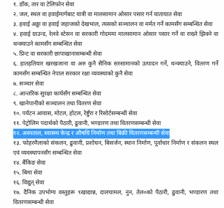 सरकारले २०७६ चैत पहिलो साता राजपत्रमा सूचना प्रकाशित गरेर १७ वटा अत्यावश्यक सेवाका क्षेत्र रहेको उल्लेख गरेको छ। सो व्यवस्थाको १२ नम्बरमा अस्पताल, स्वास्थ्य केन्द्र र औषधि निर्माण तथा बिक्री वितरण सम्बन्धी सेवा रहेको उल्लेख छ ।