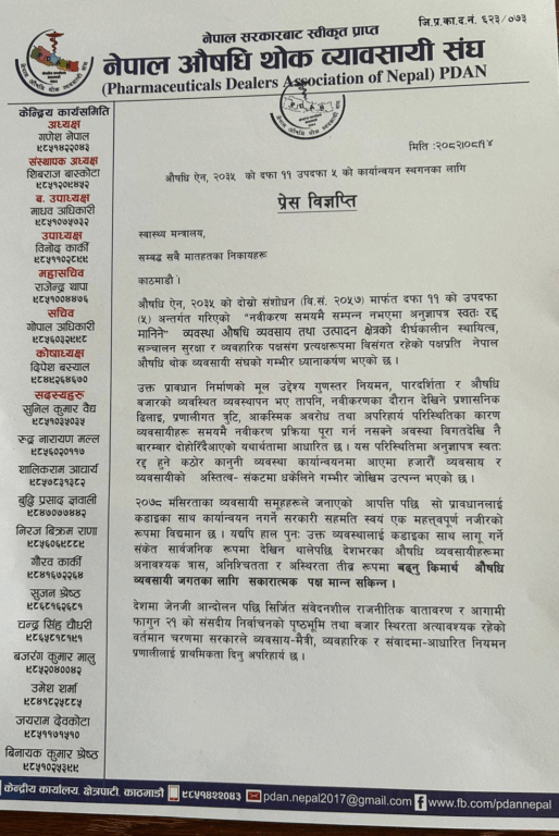 पीडानले ५ बुँदे मागसहित विज्ञप्ति निकालेको छ । विज्ञप्तिको बुँदामा उल्लेख छ, औषधि ऐन २०३५ दफा ११ (५)को अनुज्ञापत्र स्वतः रद्दको प्रावधानको कार्यान्वयन तत्काल स्थगन गर्नुपर्ने, नवीकरण प्रक्रियालाई डिजिटल, पारदर्शी, छिटो तथा व्यवसाय मैत्री बनाइ प्रशासनिक ढिलाइ र प्रणालीगत कमजोरीहरू पूर्ण रूपमा न्यूनिकरण गर्न आवश्यक कानुनी र प्राविधिक संरचना अविलम्ब कार्यान्वयन गर्नुपर्ने छ ।