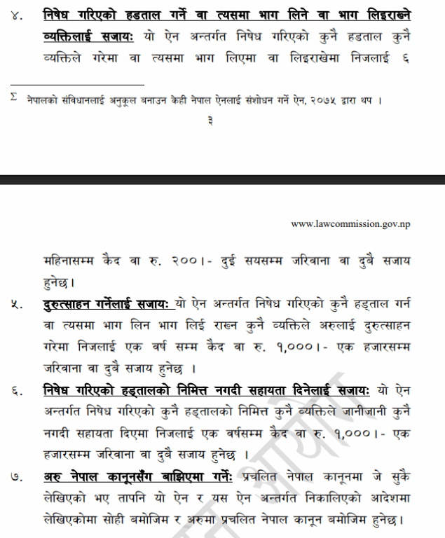 अत्यावश्यक सेवामा कुनै हड्ताल वा निषेध गरेमा व्यक्तिगत रुपमा ६ महिनासम्म कैद वा २ हजार रुपैयाँ वा दुबै सजाय हुने व्यवस्था छ ।