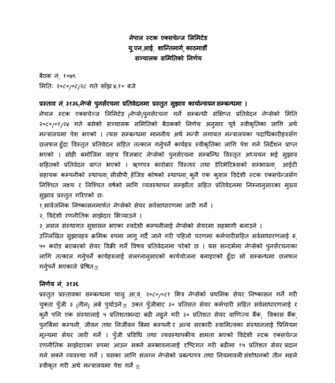 नेप्से पुनर्संरचना प्रतिवेदनमा प्रस्तुत सुझाव कार्यान्वयन सम्बन्धमा नेप्से सञ्चालक समितिले २०८० मंसिर २८ गते गरेको निर्णयमा आव २०८०/०८१ भित्र नेप्सेको प्रथमिक सेयर निष्कासन गर्ने गरी चुक्ता पुँजी ३ (तीन) अर्ब पुर्याउने र उक्त पुँजीबाट ३० प्रतिसत सेयर कर्मचारी सहित सर्वसाधारणलाई र कुनै पनि एक संस्थालाई ५ प्रतिशतभन्दा बढी नहुने गरी ३० प्रतिशत सेयर वाणिज्य बैंक, विकास बैंक, पुनर्बिमा कम्पनी, जीवन तथा निर्जीवन बिमा कम्पनी र अन्य सरकारी स्वामित्वका संस्थानलाई प्रिमियम मूल्यमा सेयर जारी गर्ने उल्लेख थियो ।