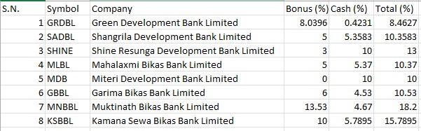 यसैबीच केही विकास बैंकहरूले पनि आर्थिक वर्ष २०८१/८२ को लाभांश घोषणा गरिसकेका छन् । नेप्सेमा सूचीकृत विकास बैंकमध्ये हालसम्म कामना सेवा विकास बैंक, मुक्तिनाथ विकास बैंक, गरिमा विकास बैंक, मितेरी डेभलपमेन्ट बैंक, महालक्ष्मी विकास बैंक, शाइन रेसुङ्गा डेभलपमेन्ट बैंक, सांग्रिला डेभलपमेन्ट बैंक र ग्रिन डेभलपमेन्ट बैंकले लाभांश घोषणा गरेका छन् ।