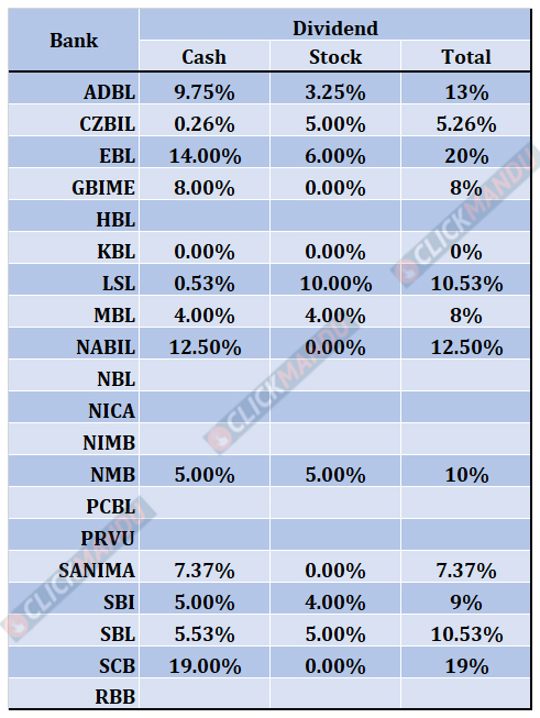 हालसम्म लाभांश घोषणा गर्ने वाणिज्य बैंकहरुमा एनएमबि बैंक, लक्ष्मी सनराइज बैंक, कृषि विकास बैंक, नेपाल एसबिआई बैंक, स्ट्याण्डर्ड चार्टर्ड बैंक, ग्लोबल आइएमई बैंक, सिद्धार्थ बैंक, सिटिजन्स बैंक, सानिमा बैंक, एभरेष्ट बैंक र माछापुच्छ्रे बैंक र कुमारी बैंक रहेका छन् ।