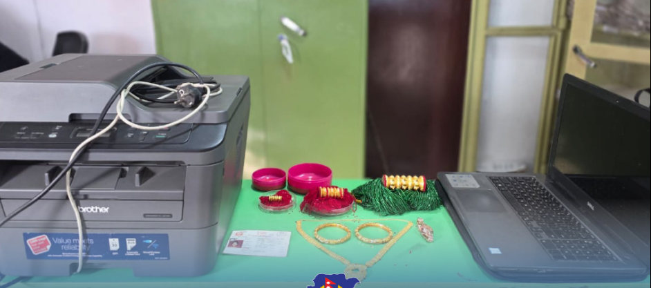 उनको साथबाट रानी हार १ थान, बाला १ जोर, सुनको छड्के तिलहरी एउटा, माहिली तिलहरी एउटा, कान्छी तिलहरी एउटा र लेडिज घडी थान भेटिएको प्रहरीले जनाएको छ । त्यस्तै डेलको ल्यापटप एउटा र प्रिन्टर एक थान पनि फेला परेको जिल्ला प्रहरी परिसर काठमाडौंका प्रहरी उपरीक्षकसमेत रहेका प्रवक्ता पवन कुमार भट्टराईले जानकारी दिए ।
