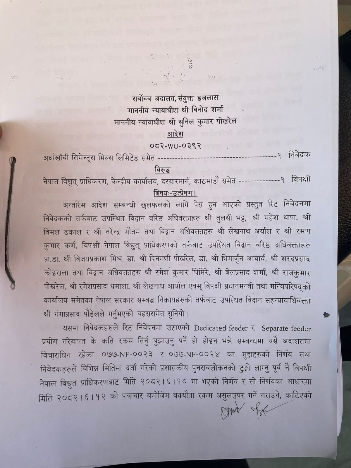 नेपाल विद्युत प्राधिकरणले २०८२ असोज १० गतेको निर्णय अनुसार उद्योगीहरूलाई बक्यौता रकम बुझाउन ताकेता गर्दै लाइन काट्ने चेतावनी दिएको थियो । सोही दिन प्राधिकरणले प्रशासकीय पुनरावलोकन खारेज गरेको थियो । सोही निर्णयका आधारमा गरिएको पत्राचार र लाइन काट्ने कार्यले आफूहरूलाई मर्का परेको भन्दै अर्घाखाँची सिमेन्टका तर्फबाट उद्योगीहरू सर्वोच्च अदालत गएका थिए ।