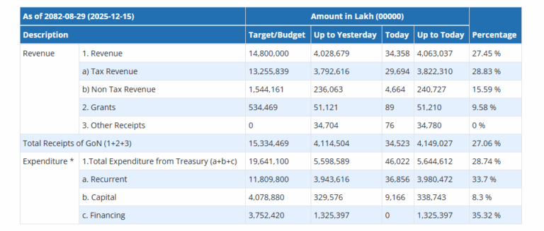 काठमाडौं । चालु आर्थिक वर्षको पहिलो पाँच महिना पूरा हुँदै गर्दा सरकारको आम्दानी र खर्च दुबै निरासाजनक देखिएको छ । सरकारले मंसिर मसान्तसम्म राजस्ववापतको आम्दानी ३० प्रतिशत पनि पुर्याउन सकेको छैन भने खर्च जम्मा २८ प्रतिशतमा सिमित छ ।