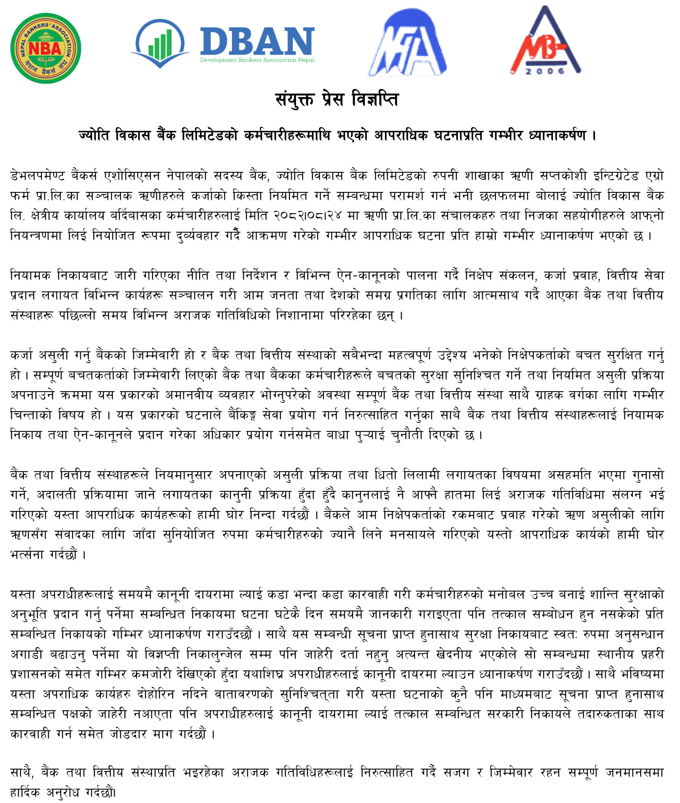 संयुक्त विज्ञप्तिमा बैंकिङ क्षेत्रका अगुवाहरूले स्थानीय प्रहरी प्रशासनको भूमिकाप्रति गम्भीर असन्तुष्टि व्यक्त गरेका छन् ।