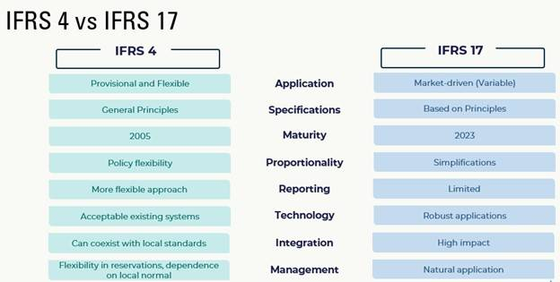 आईएफआरएस ४ अनुसार बिमा कम्पनीहरू आफ्नै देशको विधि अपनाएर वित्तीय विवरण बनाउँथे, जसले विश्वस्तरीय तुलनामा अस्पष्टता ल्याउँथ्यो । तर एनएफआरएस १७ आएपछि सबै कम्पनीले एउटै सिद्धान्तअनुसार बिमा सम्झौताको मूल्यांकन गर्नुपर्नेछ ।