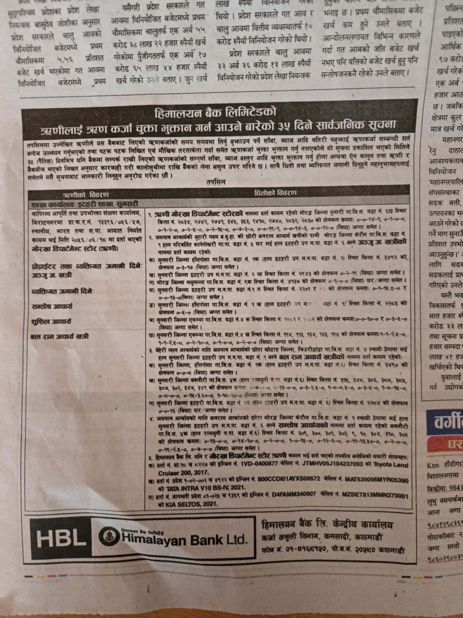 हिमालयन बैंकले गोर्खा डिपार्टमेन्ट स्टोरको सावा, ब्याज र जरिवाना रकम भुक्तानी गर्न आग्रह गर्दै यदी नगरे कालोसूचीमा राखेर बैंकको लेना असुल गर्ने चेतावनी दिएको हो ।