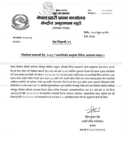 मोरङको विराटनगर स्थायी घर भई हाल काठमाडौं बस्ने ४२ वर्षीय अग्रवाललाई काठमाडौं महानगरपालिका वडा नं ४, चुनदेवीबाट पक्राउ गरी थप अनुसन्धान अघि बढाइएको छ। धितोपत्र बजारको स्वच्छता र पारदर्शिता कायम राख्न नियामक निकायको प्रतिवेदनका आधारमा प्रहरीले उनीमाथि कानूनी कारबाहीको प्रक्रिया अघि बढाएको हो ।