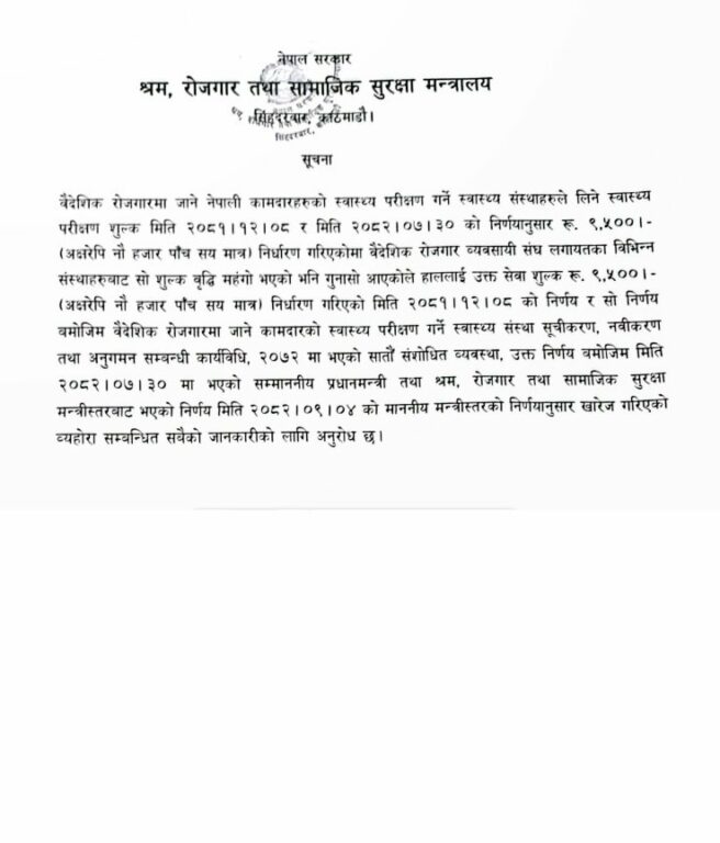 यसअघि तत्कालीन श्रममन्त्री शरदसिंह भण्डारीले भण्डारीले २०८१ मङ्सिरमा मन्त्रीस्तरीय निर्णय गर्दै स्वास्थ्य परीक्षण शुल्क वृद्धि गरि ९ हजार ५०० रुपैयाँ कायम गराएका थिए ।