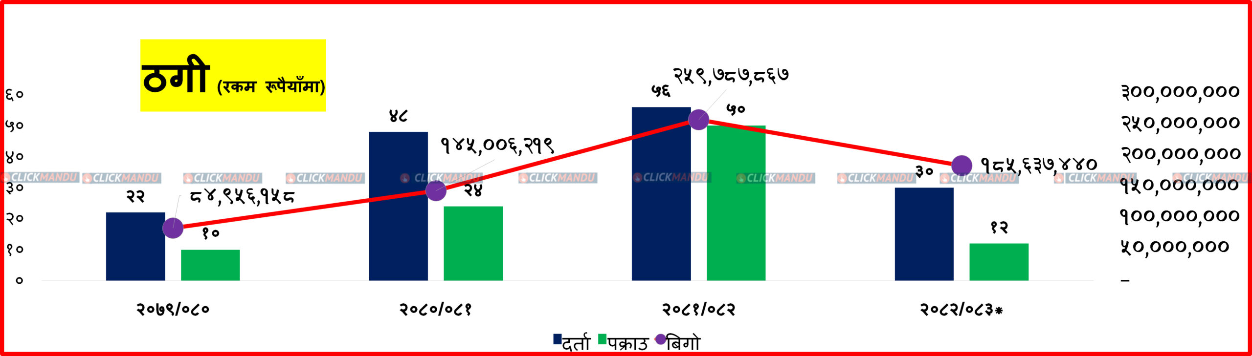 त्यस्तै, चालु आर्थिक वर्ष अर्थात आव २०८२/८३ को मंसिरसम्ममा कुल ३३७ वटा मुद्दा दर्ता भएका छन् । प्रहरीका अनुसार ३९ जना पक्राउ हुँदा ९५ करोड २० लाख २४ हजार २५ रुपैयाँ बराबरको वित्तीय अपराध भएको घटना प्रहरीकहाँ आइपुगेका छन् ।