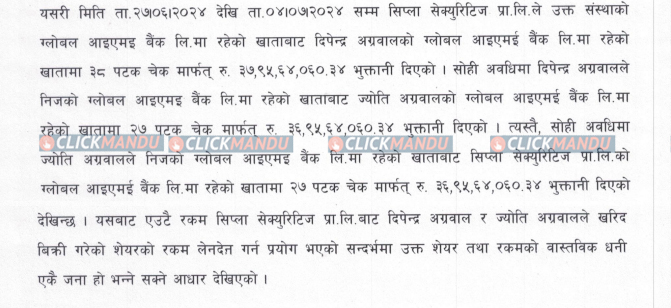 सन् २०२४ जुन २७ देखि जुलाई ४ सम्मको छोटो अवधिमा सिप्ला सेक्युरिटिजले आफ्नो ग्लोबल आइएमई बैंकको खाताबाट दीपेन्द्र अग्रवालको खातामा ३८ पटक चेक मार्फत ३७ करोड ९५ लाख ६४ हजार ६० रुपैयाँ भुक्तानी दिएको पाइएको छ ।
