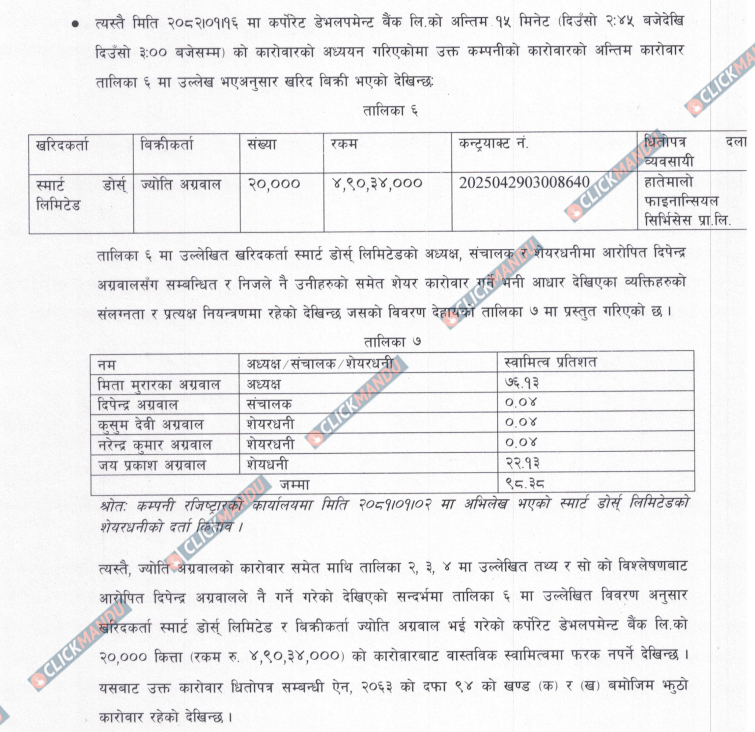 २०८२ बैशाख १६ गतेको कारोबारको अन्तिम १५ मिनेटमा ४ करोड ९० लाख ३४ हजार रूपैयाँ बराबरको कर्पोरेट डेभलपमेन्ट बैंकको २० हजार कित्ता सेयर ज्योति अग्रवालले बेचेको र स्मार्ट डोर्सले किनेको पाइएको हो । जबकि स्मार्ट डोर्सको ९८ प्रतिशत स्वामित्व दीपेन्द्रले चलाउने १५ खातामध्ये ५ वटासँग छ । यस्तो कारोबारलाई धितोपत्र ऐनले झुटो कारोबार भनी पहिचान गरेको छ ।
