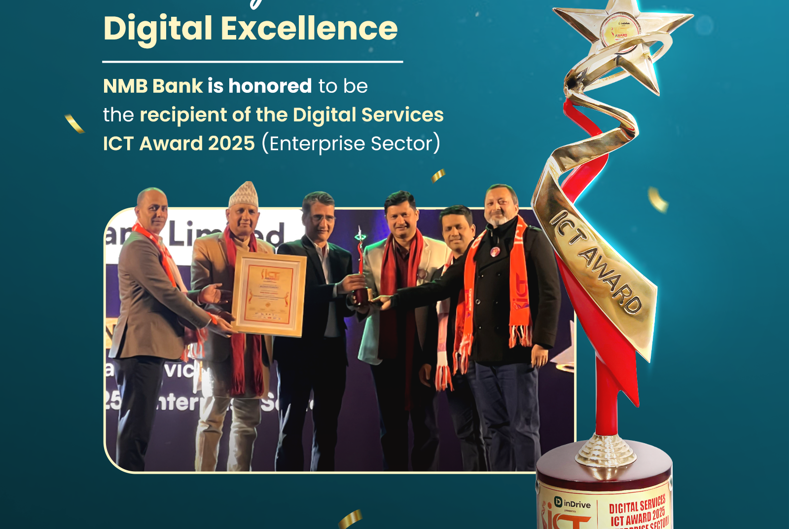 काठमाडौं । एनएमबि बैंकले डिजिटल रूपान्तरणमार्फत उत्कृष्ट सेवा प्रवाह गरेबापत डिजिटल सर्भिसेज् आइसीटी अवार्ड २०२५ (ईन्टरप्राईज क्षेत्र) प्राप्त गरेको छ ।