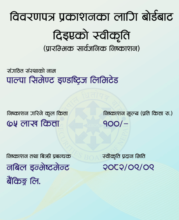 काठमाडौं । पाल्पा सिमेन्ट इन्डष्ट्रिजले प्रारम्भिक सार्वजनिक निष्कासन अनुमति पाएको छ ।