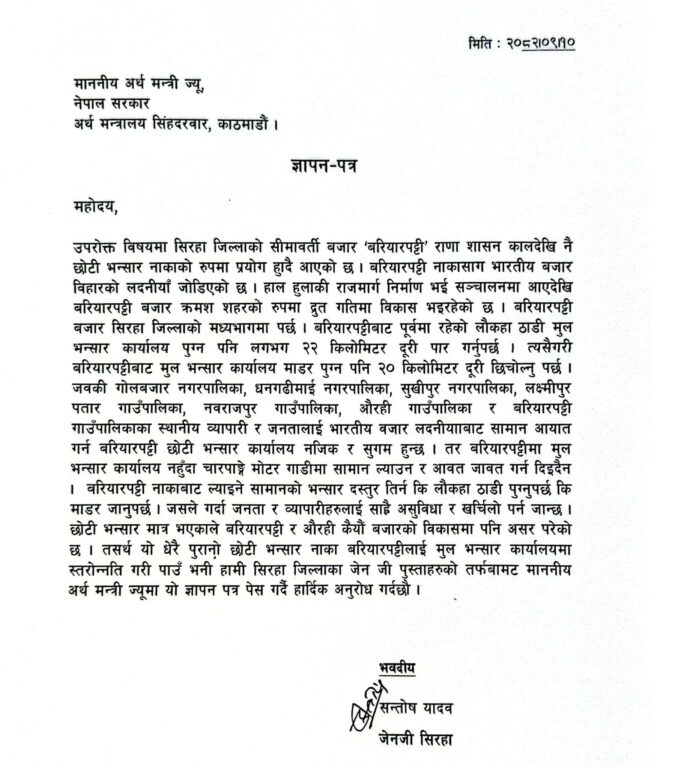 सिरहा। सिरहा जिल्लाको सीमा क्षेत्रमा रहेको बरियारपट्टी बजारमा सञ्चालन हुँदै आएको सानो (छोटी) भन्सार नाकालाई मुल भन्सार कार्यालयमा स्तरोन्नति गर्न अर्थमन्त्री रामेश्वर खनालसँग माग गरिएको छ ।
