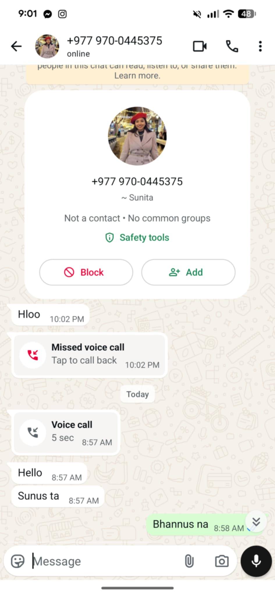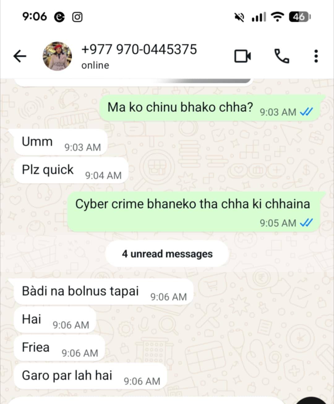 सुरूमा राति १० बजे ठगले सुनितालाई हेलो भन्दै म्यासेज गर्छन् । र भ्वाइस कल गर्छन् । शुक्रबार बिहान ठगको पुनः फोन आउँछ । २ जनाबीच ५ सेकेन्ड कुरा भएको देखिन्छ ।