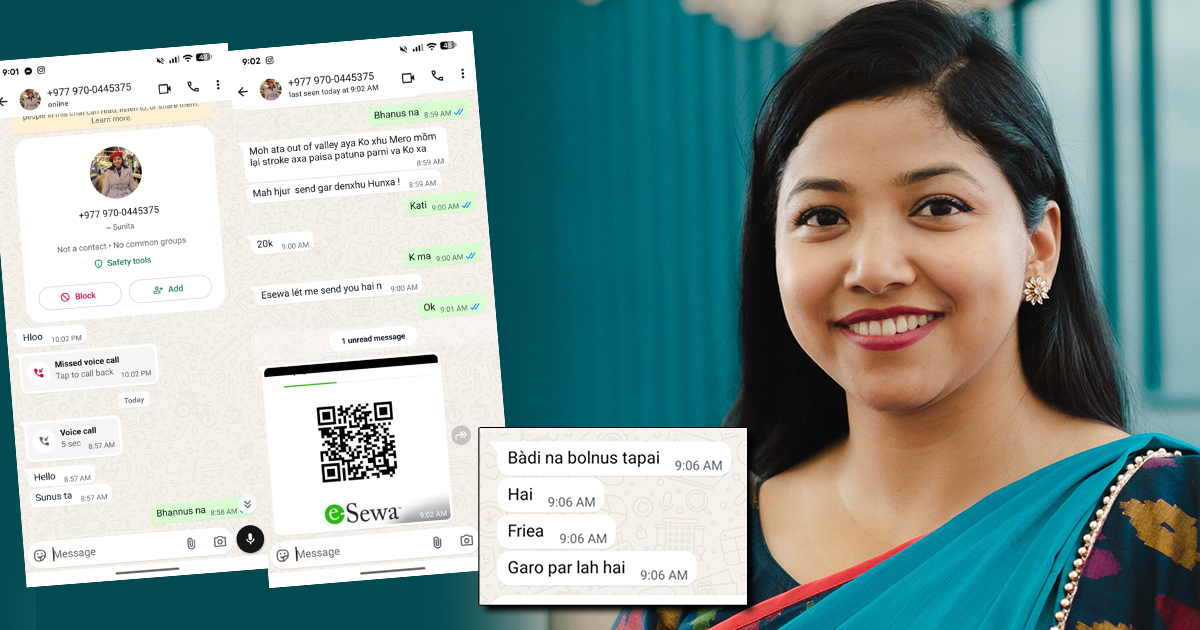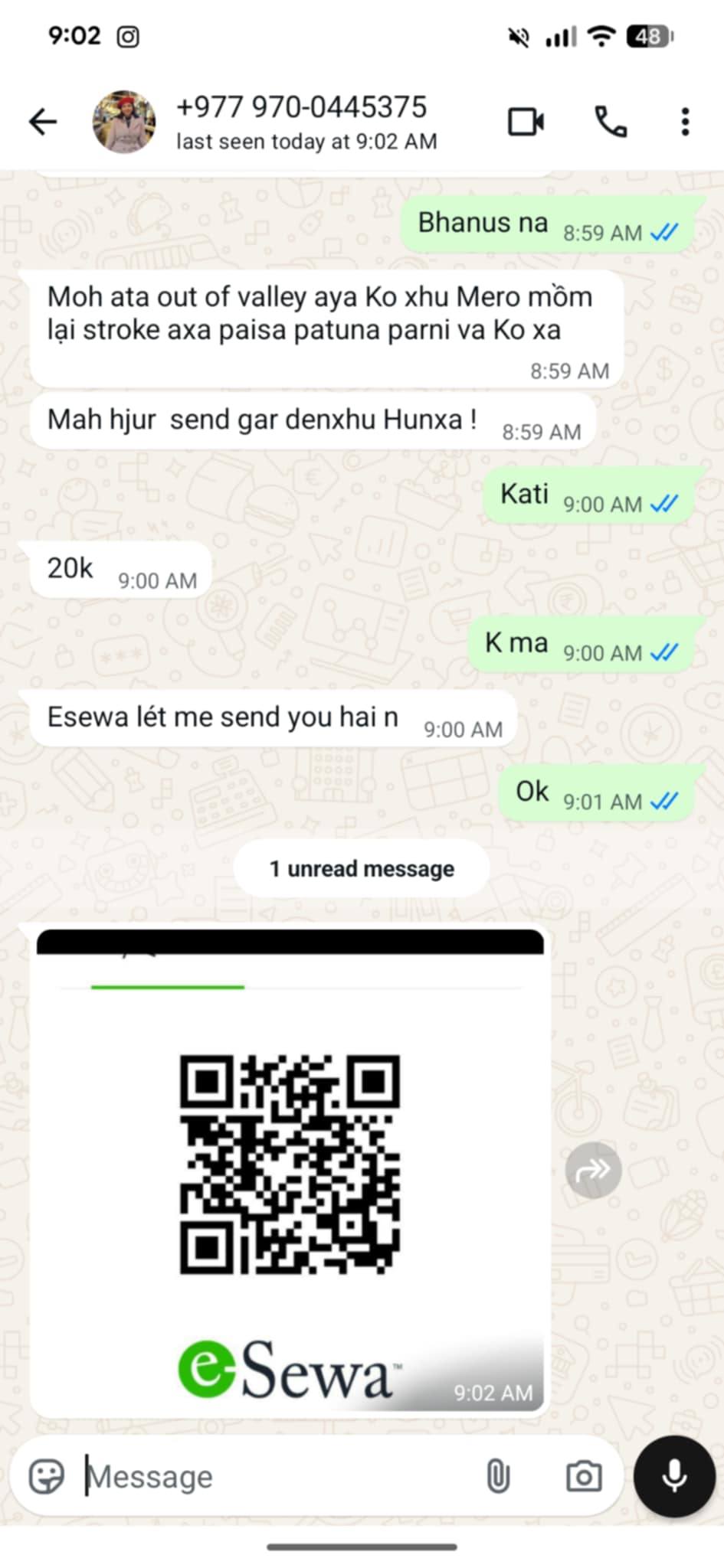 रकम भुक्तानीका लागि उनले ईसेवाको क्यूआर कोड र मोबाइल नम्बर पठाउने गरेको छ । ईसेवामा उक्त खाता ला.. माझी (मोवाइल नम्बर: ९७०१५२९८८३) को नाममा दर्ता रहेको देखिएको छ । ठगले पैसा पठाउनका लागि ‘कृपया छिटो गरिदिनुस्’ भन्दै सुनितालाई आग्रह गरेका छन् ।