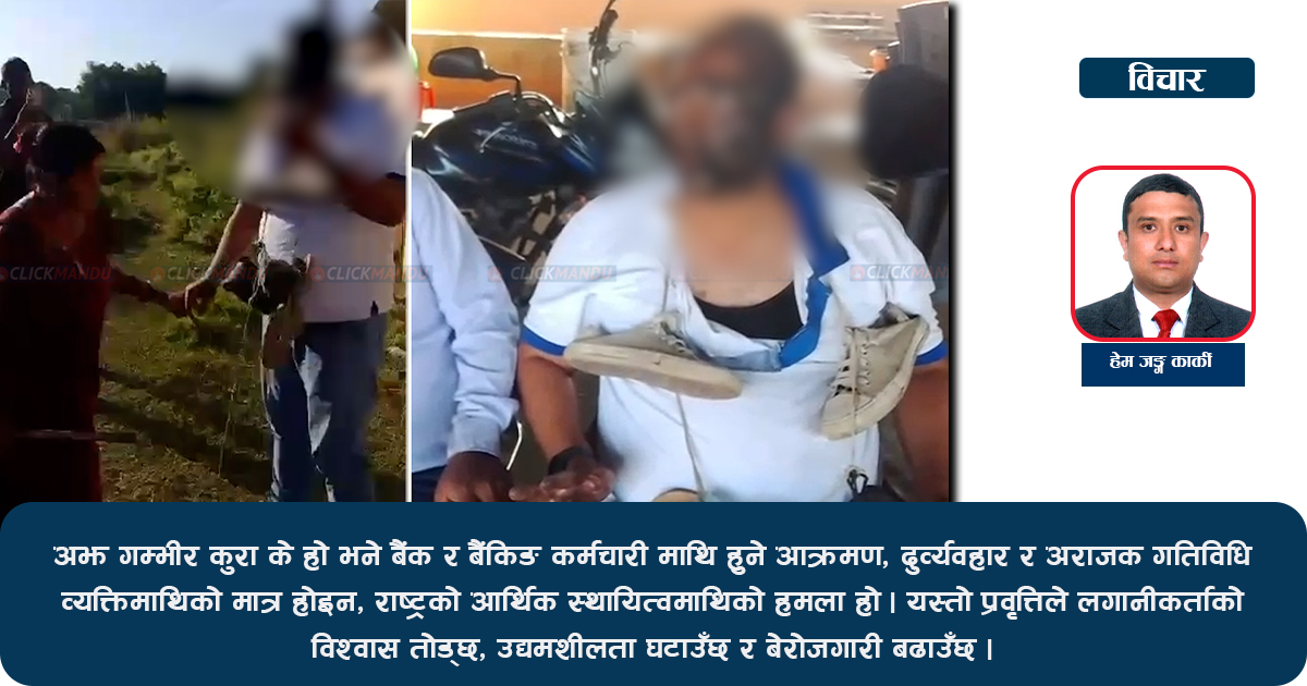बैंक नहुनु भनेको देशलाई विश्व अर्थतन्त्रबाट अलग पार्नु हो । अझ गम्भीर कुरा के हो भने बैंक र बैंकिङ कर्मचारी माथि हुने आक्रमण, दुव्र्यवहार र अराजक गतिविधि व्यक्तिमाथिको मात्र होइन, राष्ट्रको आर्थिक स्थायित्वमाथिको हमला हो । यस्तो प्रवृत्तिले लगानीकर्ताको विश्वास तोड्छ, उद्यमशीलता घटाउँछ र बेरोजगारी बढाउँछ ।