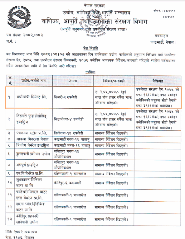 एमआरपी प्रष्टसँग उल्लेख नभएको र कुनै कुनै बोरामा तौल केही ग्राम कम भेटिएको कैफियतको आधारमा विभागले अर्घाखाँची उद्योगसँग २ लाख ५ हजार रुपैयाँ बराबरको जरिवाना गरेको थियो ।