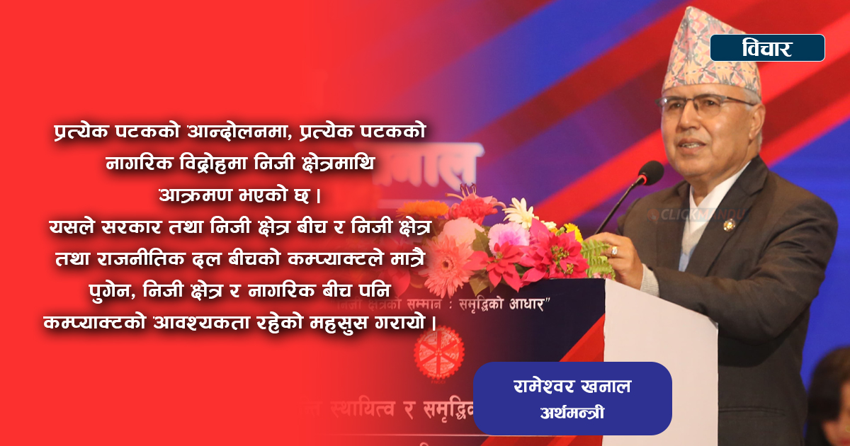(नेपाल उद्योग वाणिज्य महासंघले बुधबार आयोजना गरेको ‘शान्ति स्थायित्व र समृद्धिका लागि सहकार्य: सामूहिक पहल’ कार्यक्रममा अर्थमन्त्री रामेश्वर खनालले व्यक्त गरेको विचारको सम्पादित अंश ।)