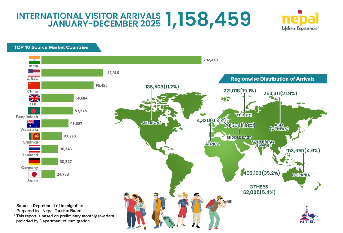 काठमाडौं । नेपालमा पर्यटन आगमन सन् २०२५ मा ११ लाख ५८ हजार ४५९ पुगेको छ । नेपाल पर्यटन बोर्डले सार्वजनिक गरेको अध्यागमन विभागको तथ्यांक अनुसार नेपालमा सन् २०२५ मा आएका पर्यटक गत वर्ष सन् २०२४ को तुलनामा १० हजार ९११ जनाले बढेको छ ।