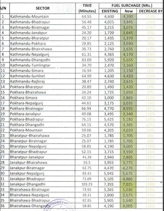 काठमाडौंबाट हुने उडान अर्थात ट्रङ्क रुटको हवाई भाडामा माउन्टेन २१०, भन्द्रपुर १८०, विराटनगर १४०, जनकपुर ७५, भरतपुर ६५, पोखरा ९५ र भैरहवाको १२५ रुपैयाँले इन्धनको शुल्क घटेको छ । यस्तै नेपालगन्ज १९५, तुम्लिङटार ११०, सिमरा ५५, सुर्खेत २१० र राजविराजको १२५ रुपैयाँले इन्धको शुल्क घटेको हो ।