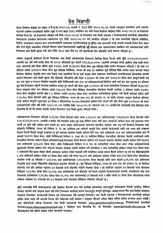 काठमाडौं । रिलायन्स स्पिनिङ मिल्सको आईपीओ बाँटफाँट भएको छ । गत पुस ७ गतेदेखि ११ गतेसम्म सर्वसाधारणका लागि खुला गरिएको आईपी शुक्रबार बाँडफाँड गरिएको हो।