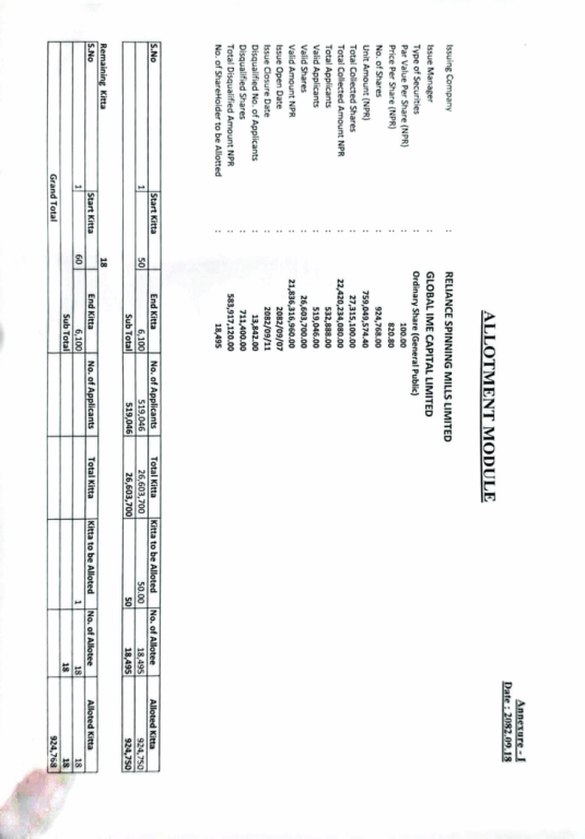 जसअनुसार कुल १८ हजार ४ सय ७७ जनालाई ५०-५० कित्ता र १८ जनालाई ५१-५१ कित्ता सेयर परेको छ । कुल ५ लाख ३२ हजार ८८८ जनाले आवेदन दिएकामा ५ लाख १९ हजार ४६ जना योग्य आवेदन थिए । उनीहरूमध्ये १८ हजार ४ सय ९५ जनाले सेयर पाएका हुन् ।