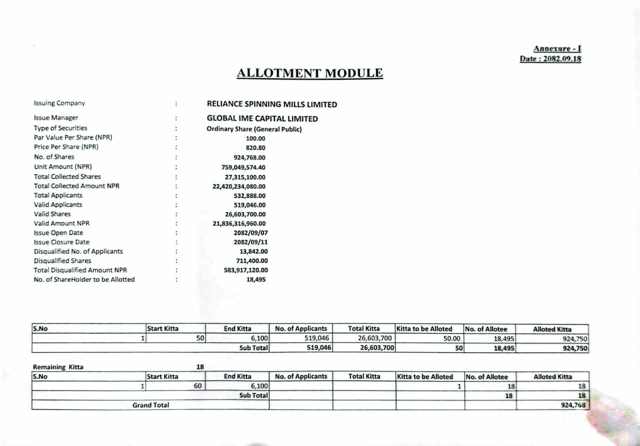 जसअनुसार कुल १८ हजार ४ सय ७७ जनालाई ५०-५० कित्ता र १८ जनालाई ५१-५१ कित्ता सेयर परेको छ । कुल ५ लाख ३२ हजार ८८८ जनाले आवेदन दिएकामा ५ लाख १९ हजार ४६ जना योग्य आवेदन थिए । उनीहरूमध्ये १८ हजार ४ सय ९५ जनाले सेयर पाएका हुन् । सेयर पाउनेको विवरण केहीबेरमा हेर्न सकिनेछ ।