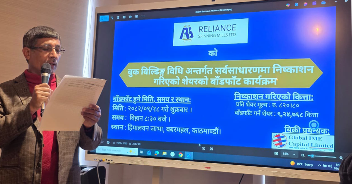 काठमाडौं । रिलायन्स स्पिनिङ मिल्सको आईपीओ बाँडफाँड भएको छ । गत पुस ७ गतेदेखि ११ गतेसम्म सर्वसाधारणका लागि खुला गरिएको आईपी शुक्रबार बाँडफाँड गरिएको हो ।