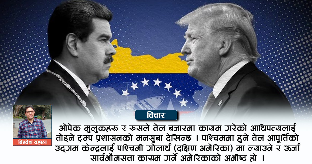 ओपेक मुलुकहरू र रुसले तेल बजारमा कायम गरेको आधिपत्यलाई तोड्ने ट्रम्प प्रशासनको मनसुबा देखिन्छ । पश्चिममा हुने तेल आपूर्तिको उद्गम केन्द्रलाई पश्चिमी गोलार्ध (दक्षिण अमेरिका) मा ल्याउने र ऊर्जा सार्वभौमसत्ता कायम गर्ने अमेरिकाको अभीष्ट हो