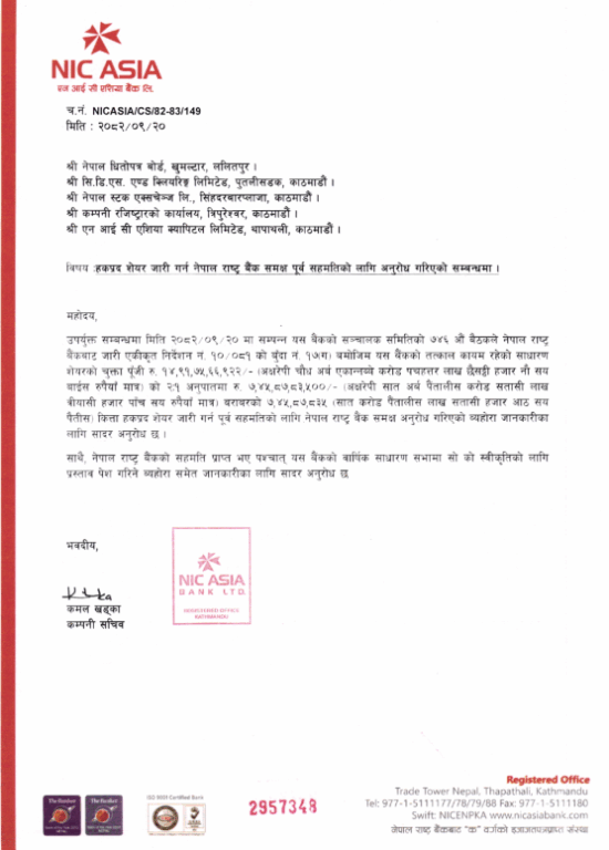 पुस २० गते बसेको बैंकको सञ्चालक समितिको बैठकले सो दरमा हकप्रद सेयर निष्काशन गर्ने निर्णय गरी राष्ट्र बैंकसँग अनुमति माग गरेको हो ।