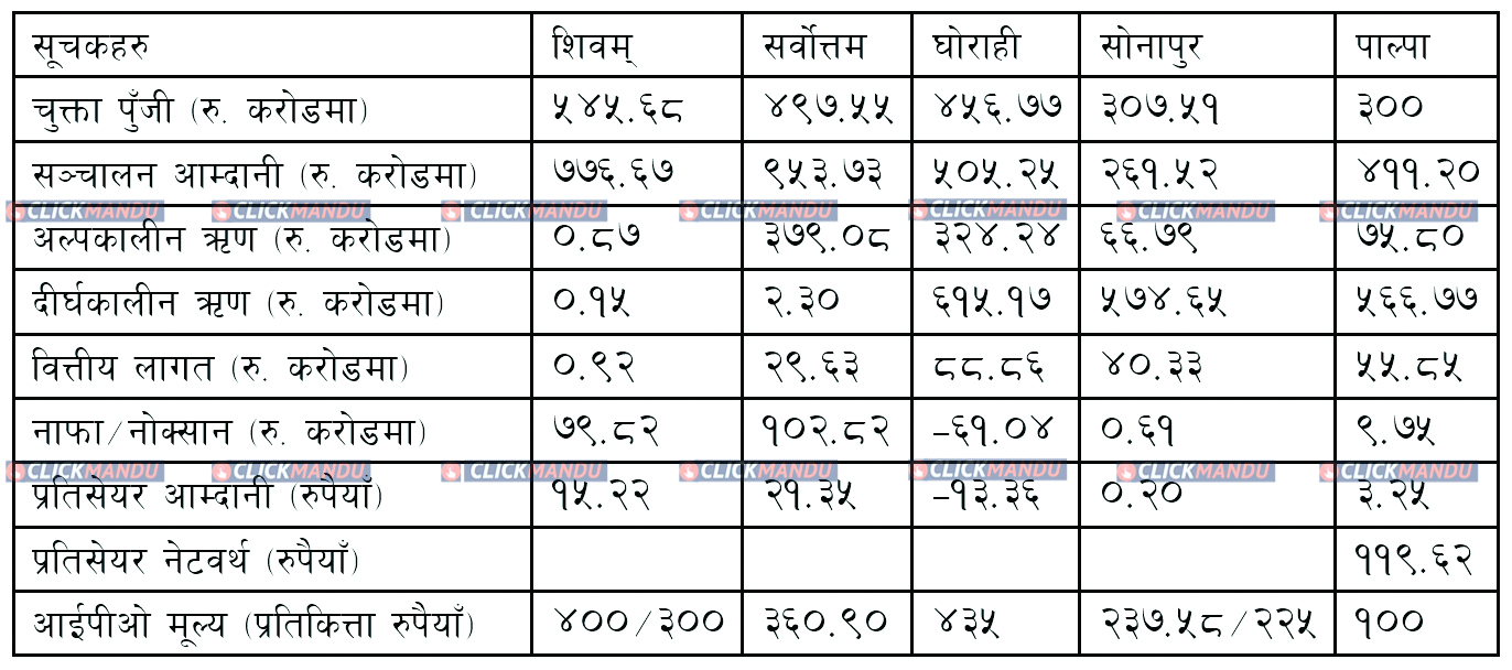 आईपीओ जारी गरेका अन्य ४ सिमेन्ट कम्पनी र पाल्पा सिमेन्टको वित्तीय सूचक तथा मूल्यबीच तुलनाः
