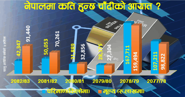 भन्सार विभागको तथ्यांकअनुसार आर्थिक वर्ष २०७९/७९ सम्म चाँदीको पर्याप्त परिमाणमा आयात भइरहेको थियो । त्यो आर्थिक वर्षमा १ लाख ६७ हजार ७ सय ११ किलो र आर्थिक वर्ष २०७७/७८ मा १ लाख ७ हजार २ सय ११ किलो चाँदी नेपालमा आयात भएको थियो । आर्थिक वर्ष २०७९/८० देखि भने आयात घटेर वार्षिक रुपमा ३२ हजारदेखि ५० हजार किलोसम्ममा सिमित भएको थियो ।