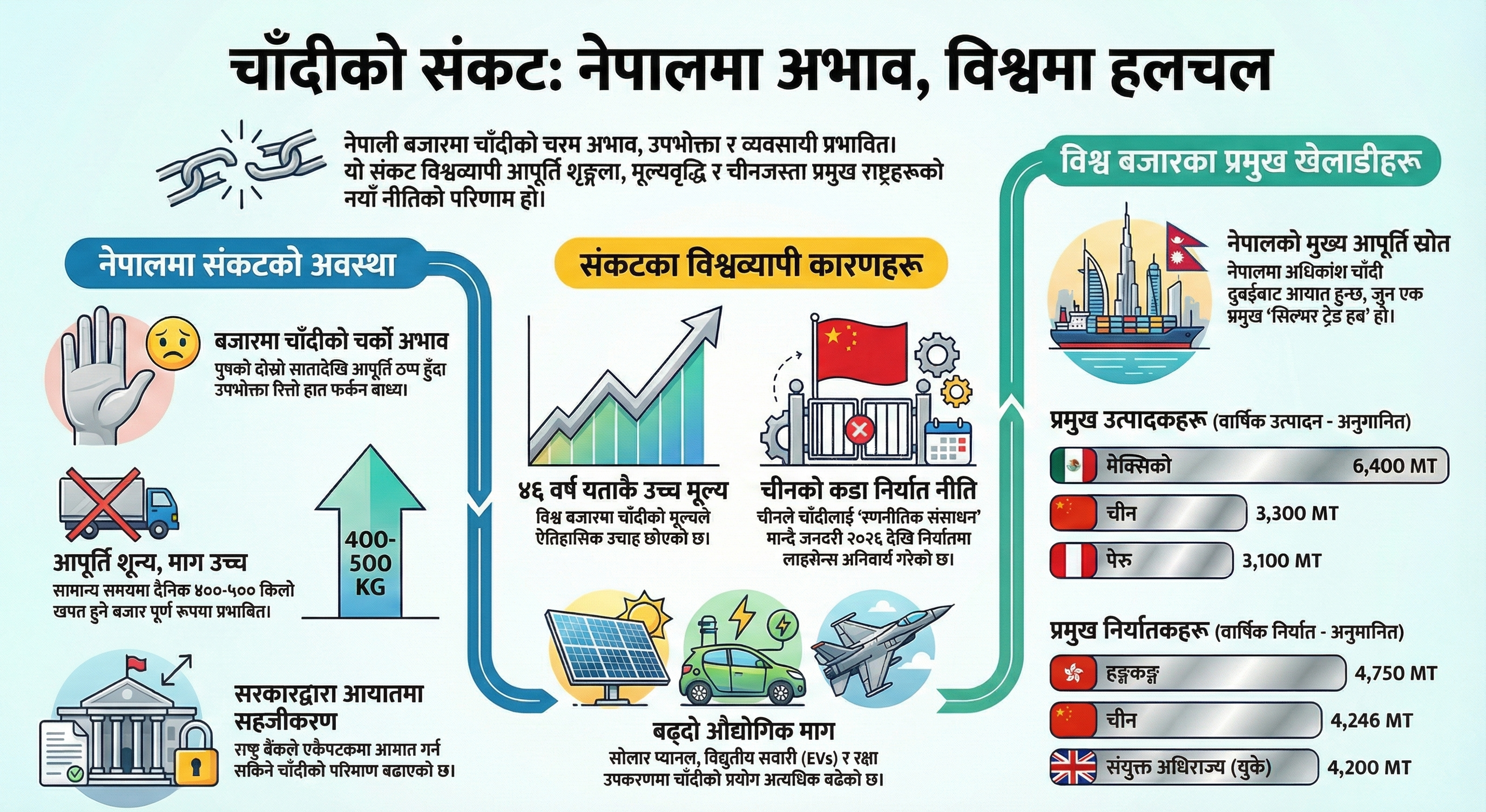 चीनले १ जनवरी २०२६ देखि चाँदी निर्यातमा कडा लाइसेन्स नीति कार्यान्वनयमा ल्याएको छ । निर्यात प्रक्रियालाई अत्यन्त सिमित बनाएर चीनले अहिले चाँदीको डेलिभरी प्रक्रियासमेत निक्कै साँघुरो बनाएको छ ।